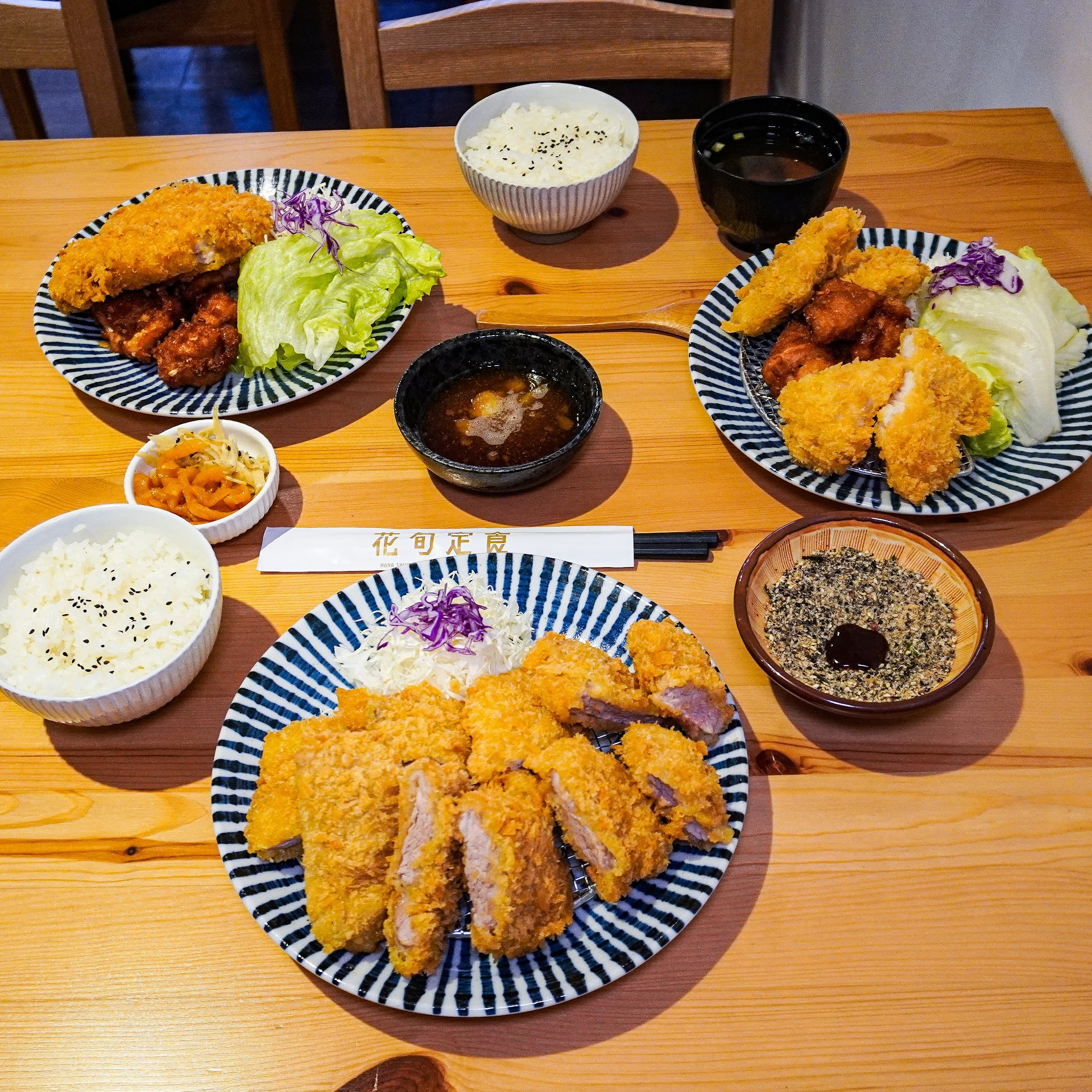 ·定食套餐都會附 *越光米飯 *味噌湯 *生菜(皆可續加) *$40甜點 *60飲料 超過皆可補差額。重點我覺得很貼心的一點是,旁邊有一小碟的漬物幫忙解油膩,有牛蒡絲跟醃蘿蔔。 桌邊有和風柚子風味的沙拉醬可以搭配生菜;還有蔬果甘甜口味的豬排醬可搭配炸物或生菜。