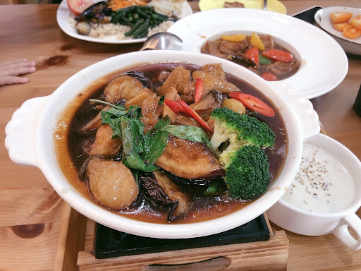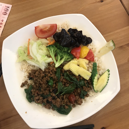 Read more與朋友到南部玩,因為有人吃素所以因緣際會發現了這間五星餐館,四個人點了泰式打拋飯、泰式青檸酸辣燉飯、麻油猴頭菇湯麵線、炒什錦鮮蔬,口味獨特、配料豐富而且調味都很精準到位,不會有素豆製品的味道,風味符合菜名應有的味道。都是原型食材入菜,重點是胚芽米超級好吃,老闆說吃對主食腸胃才會健康,連套餐附的一碗清湯都是有功夫在裡面的,五星不意外,非常推薦給同行有吃葷吃素的朋友一起來用餐,老闆很熱情會跟你聊...
