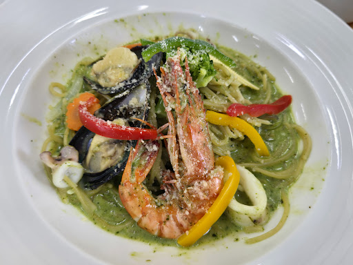 潮州鐵道園區內的餐廳,以觀光區來說餐點算是不錯了,一個套餐300多元附飲料(可調無糖)、湯品和甜點(奶酪頗好吃),份量滿大的吃完有飽足感,每人門票可以折抵50元記得用,不過內用冷氣不太冷,還有蒼蠅在飛。店員服務不錯,有兒童椅、兒童碗和湯匙(ikea的),滿親子友善的。 ✅奶油菠菜焗烤千層麵:這道是最好吃的,焗烤很香千層麵也很棒,奶味和起司味都滿重的,份量也令人滿意,不過吃到最後小膩 ✅奶油青醬海鮮義大利麵:有平均以上水準,奶油青醬夠濃偏甜口,海鮮品質有過關,在觀光區這樣很OK了 ✅泰式椒麻雞:不錯,調味偏酸微辣,雞肉好吃,就是貴了點 ✅兒童餐:非常快樂不太健康的兒童餐😅...