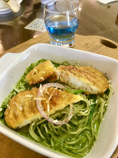 香烤無骨鮮魚青醬義大利麵 說是香烤感覺好像是炸魚排 有點小失落但青醬很有水準 濃稠卻不油膩裹著麵很滑口