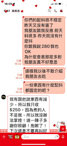 食物質素低下。老闆娘作出種族岐視,對我的國籍侮辱,亦是不能接受。我點餐沒有說任何話,你卻無故問我是否香港人,無故說不信香港人,說我們親中。你知道有多少香港人因為反送中的事得了創傷後遺遠離自己地方避難嗎?你能否保證你眼前的香港人不曾反抗過中國嗎?我在你面前說甚麼政治事的話,是我的問題,但我沒有!你要討論台灣政府如何應對,是可以理性討論的政策,但不是你無故人身攻擊的理由。