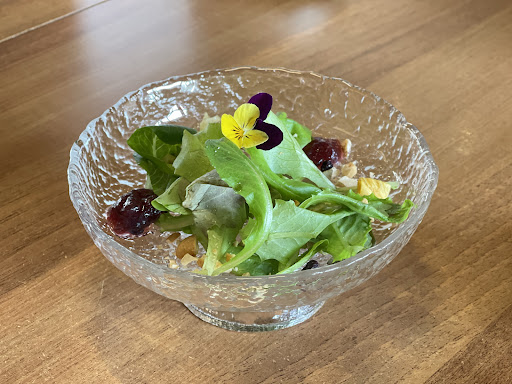 第一道蟹肉跟日式甜點的餅皮做搭配,完全不知道在吃什麼沒有蟹肉味就算了,還很甜很濕整個詭異至極🤢