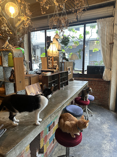 The café itself is beautifully decorated, with charming details and cozy spots to sit. It’s a perfect mix of vintage vibes and romantic ambiance, definitely a must-visit if you're a fan of cats, great drinks, or just want to feel like you're in the set of a cute, quirky movie. If you're ever in Chiayi, make sure to swing by IN COFFEE it's the perfect place to relax and enjoy a little bit of feline sophistication. Ohhh there is also a machine with balls with keychains of the gentlemen cats inside. Only 50$ for one! The...