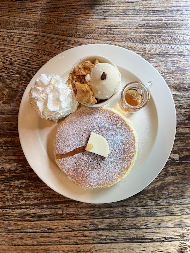 Read moreThe pancakes here were 10/10, they were thick and cooked perfectly, served hot with butter melting on top. The honeycomb ice cream was a spectacular addition adding that caramelised flavour and all together with the maple syrup it was perfect. The interior was beautiful, as were the views into the greenery of hinoki village. The service was friendly but very slow, with the pancakes taking at least 20 min to come to the table with no other customers in the store, however it was ok as the atmosphere is beautiful. We ordered the cafe au lait which was very watery and a bit weak, and overpriced for the quality so wouldn’t...