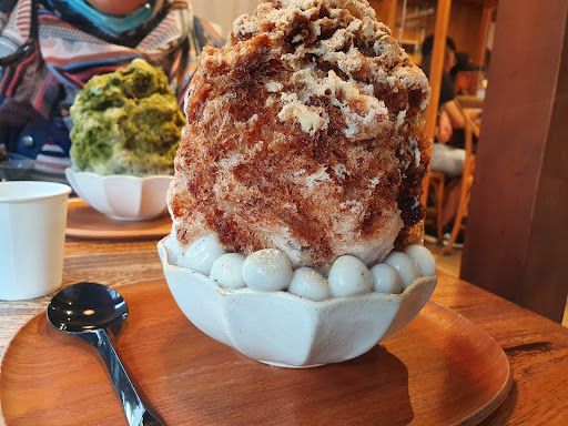 There are two types of shaved ice which we can order, matcha and black tea. Inside both of the shaved ice, there is small peanut mochi, but there is also some sticky rice inside the matcha one. If you dont like sweet, it is better to order the matcha, since the black tea shaved ice has more brown sugar flavor in it - - "