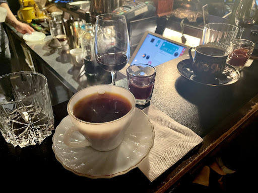 We sat at the counter and had two pour-overs, a light-medium roast called Figaro’s Wedding, and a dark roast called Black Pearl. It took a while to make because of the care the barista put into making it, measuring out the quantity of bean and the water temperature, etc. Each drink has its own special label, and is served with its own porcelain. The barista was really friendly and let us try the mulled wine and Stone Cold Fox, both of which were excellent. We also had the tiramisu, which had just the right amount of sweetness and rum flavor.