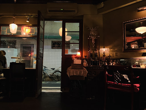店内はまるで映画の中のワンシーンに紛れ込んだような雰囲気。深紅のソファ(フランス製?)をはじめ、ランプ、シェード、椅子、テーブルなどのアンティーク家具、額縁、鏡、蓄音機、ミシンなどの各種雑貨類が整然と並び、窓際のカップルまで絵になる。 お手洗いの天井や壁も渋い(古いバスルームだった)。
