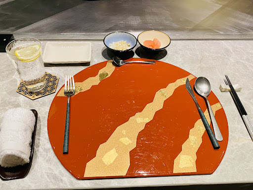 Read more▪️開胃小菜-梅漬佛手瓜,清爽好吃。▪️洋蔥湯(湯品4選1):就是一般的法式洋蔥湯口味,就不贅述。▪️小章魚,軟中帶脆。▪️蟹腳們已經撥好,食用起來很方便,蟹肉不會乾柴。▪️海膽佐塔塔醬,味道偏淡的海膽,搭配下面的塔塔醬,在味道上有點搶戲,味道上會蓋過海膽。▪️日本薩摩芋頭 鮑魚煮的口感Q脆;芋頭雖然幾乎沒什麼味道,但有Q度的口感,很特別,與台灣芋頭綿密的口感不同▪️軟殼小龍蝦中規中矩,強調是酥脆軟殼可直接下肚。▪️香煎鵝肝軟嫩適中,美中不足是油了點。▪️日本紐約客和牛,雖說適合的品嚐方式是外酥內軟嫩,但個人覺得可惜的是:牛肉外層過「赤」,吃起來稍微乾了點。▪️炒飯有醬油調味,稍微鹹了點,但粒粒分明,口感不錯。▪️牛肉片涮壽喜燒醬汁,壽喜燒醬調味比較重些,當浸潤過醬汁的牛肉片入口,只有壽喜燒醬的味道,反而嚐不出期待的牛肉鮮甜。▪️芋頭卷裡頭芋頭緊實又綿密、甜度微甜,個人喜歡芋頭,所以這道飯後甜點是我的菜。飯後飲品有幾種咖啡或茶類可選。 這家是無菜單料理餐廳,食材新鮮,餐廳在開始上鐵板製作前,會先展示食材於鐵板上,供顧客觀賞拍照。餐廳內的侍桌人員服務態度親切,用餐環境自在。這次的價格是NT$7000 +...