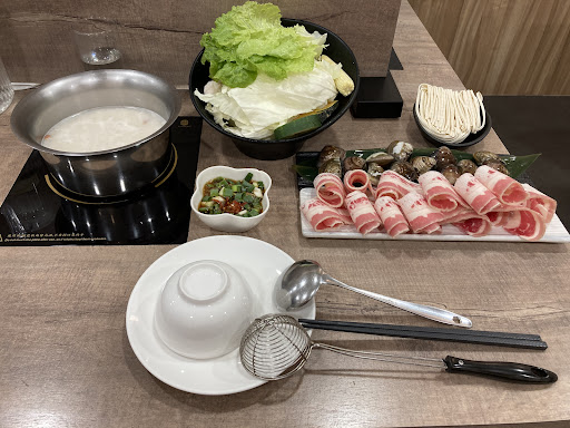 先說湯底,雖然店名叫「麻辣」但實際上沒有提供麻辣鍋,白色麻辣鍋應該是指店裡面的招牌老火湯,但其實只有辣而沒有麻味。 這次依照店員推薦點了招牌老火豬肚煲湯,雖然要+80元,但湯頭確實是蠻好喝的,雖然我沒點過不加價的老火湯底,不知道+80元是否單純只是湯底多了很多豬肚在裡面。 湯頭胡椒味很厚,強烈建議下肉之前先裝個一碗湯,等等慢慢喝,湯頭真的不差,因為煮完肉味道就會走味了。 一開始的湯頭是真的不錯,肉跟菜涮熟後不用沾料也可以吃出味道來,但不確定加湯的湯底是否比較淡(自助區是有「老火湯」的湯壺,但我都是請店員協助加湯,也不確定免費老火湯的湯底跟豬肚煲湯的湯頭是否差很多),加了一兩次湯後就沒有一開始的湯頭的味道了。