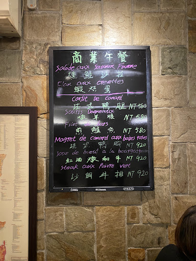 Read moreWhat a wonderful place to have a meal. It felt as if we'd been suddenly transported to a small restaurant in France-- except the waiter was very nice. We had the lunch set menu and at 550 NT, it was great value. The meal started with cottony bread, tapenade and butter. The soup (pumpkin and carrot?) was mild with a good hit of pepper. The shrimp pudding (a mousseline, i think) was featherlight and you could taste the butter and cream as each mouthful melted away on your tongue. The smoked salmon salad was beautifully plated and tasted lovely. The lamb shank main was excellent but I think the chicken stole the show. It brought me to an alternate universe where I had a French grandmother who could be bothered to cook for me, and life was altogether better. Also, the chicken gravy was to die for. The desserts were both excellent: we tried the chocolate fondant and the baked egg white. But I saw a lady at the next table eating the plum pastry (I suspect it was a clafoutis) and immediately had dessert envy. Another visit...