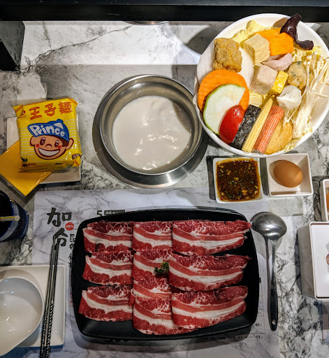 The best hotpot broth I've ever had! Highly recommend trying the milk broth! It's unique and flavorful. Even when my sense of taste has been dulled by a cold, I could taste how good it was. And for $339 NT or ~$11 USD, the price is ridiculously cheap for the quality and quantity of food you get. Unfortunately, the menu was only in Chinese, so here's what the $339 NT gets you: 1 choice of broth, a large bowl of assorted veggies/fish balls/tofu, 1 choice of meat, 1 egg, 1 portion of noodles or rice with a slice of American cheese, and 1 grass jelly dessert. You also have a choice of two beverages: plum or red tea. The only thing I wish they would change is adding more options at the sauce bar. I would have liked to have some sesame paste in my sauce. Still, even though this isn't a buffet style hotpot place, I was extremely full and satisfied with the amount/diversity of food. I was also pleasantly surprised that when they refilled our broth, they still used milk broth instead of hot water or a standard pork broth like most other hotpot places I've been to. Service was good; the restaurant itself was small, so we had to wait a little bit before being seated. Definitely recommend...