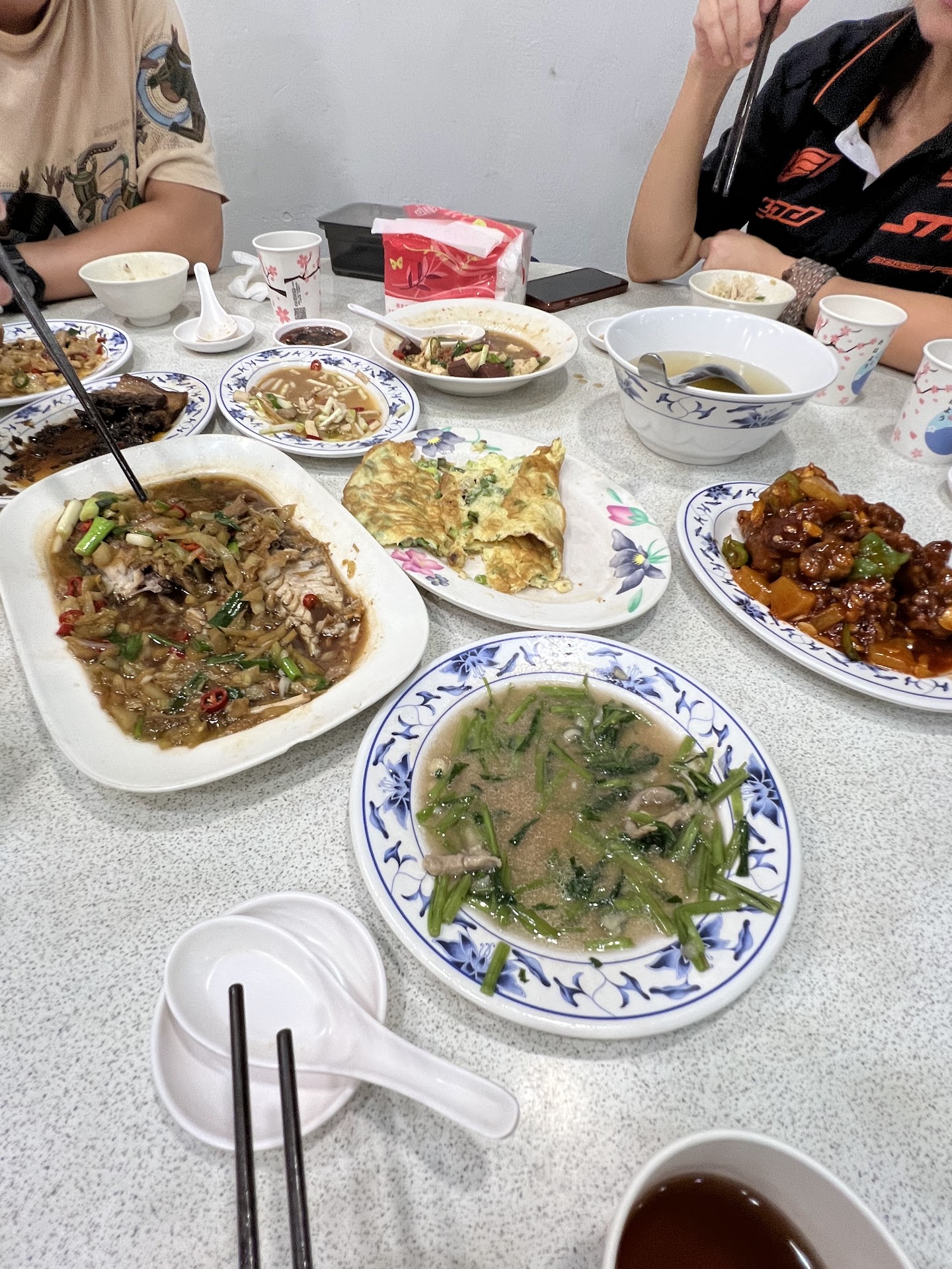 店內就像是時空被凝結了一樣,好似歲月停留在二十年前一樣,白色的日光燈略顯昏暗的照著、客人們愉快的用餐聊天、桌子是白色帶有班點的大圓桌、塑膠的黑色筷子、牆上手寫的紅色掛牌式菜單,讓人彷彿進入時光隧道一樣,好似從來沒有疫情、餐廳門擋住了一切紛擾,此時此刻所有人僅僅是分享美食而已。