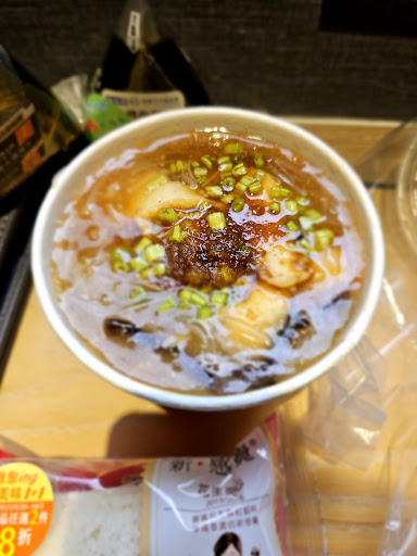 For breakfast, we had a small original rice noodle soup and another small tripe rice noodle soup. Though we were full from the noodle soups, which overflowed with delicious and satisfying flavour, we had to try the smoked duck rice ball. It's a meal in itself, a mix of different textures hugged by black rice. Everything in it made for the tastiest meal. Wrapped in a plastic bag, we were able to take half of it away with us for snacking. Eating it can get messy though, so best to do it seated. Seating at the shop was limited, there were only 3 seats outside, but one can always ask the vendor to just have take-out/take away as most locals do. The English menu is visible alongside the local one, with options to simply point at what you want at the ordering window. If you do eat in, bring your rubbish back to the window for disposal, something I was able to do after I observed previous customers. In all, this little shop provided an amazing meal for NT$200 for 2 people, with a super efficient and friendly guy at the till. I would definitely recommend you try it if you're...