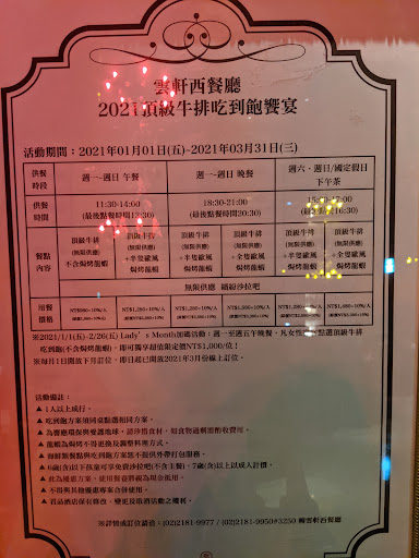 Read moreWent there for the first time with an all-you-can-eat ticket. (I bought it, not for free.) Upon arrival, I didn’t expect too much of the food because of the deco in the dim light. However, they have awesome steak and mashed potato. And as a person not so fond of chocolate, their chocolate cake was super delicious! I also like that they have live piano performance. The lady that played tonight was pretty good. What’s more is that they have good service. I actually came here to apologize for not being careful enough with how much I was able to eat and had too much leftover. It wasn’t what I meant to do. It was a mistake. I’ll be more careful next time I go there. But the lady that served our table didn’t blame us at all. Will...