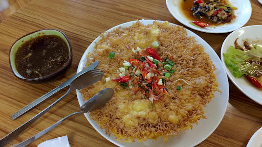 來東港本來就是要造訪東港漁港漁產品直銷中心,也就是華僑市場,無奈老婆大人覺得市場衛生條件不好,拉了行李往市區走,找到這家餐廳,我們在找東港才有的蜂巢蝦啦~! 我們算蠻早到餐廳,點餐是在門口現點,深怕價格太高或踩雷,既然來了就點了吧~菜色因食材價格有高有低,大家記得要先詢問清楚價格喔~ 主要必點蜂巢蝦!其它詢問了在地菜色搭配享用~服務人員熱情且客氣,有問必答!雖然他不太推薦蜂巢蝦他覺得不就是煎蛋~哈~應該是他個人感覺!我覺得口味就是醬子—全是個人感覺,回來才看到餐廳有些評論不是很滿意,但我來的整體感是非常滿意的~! 來海邊就是要點海菜,靠山吃山靠海吃海,在山上點什麼海鮮嘛! 蜂巢櫻花蝦、涼拌海菜、炒西施舌、炒魚腱、炒沙魚~很經濟的點法! 涼拌海菜酸甜開胃,海菜沒有腥味!回來才發現它是大鵬灣的水雲菜~ 西施舌北部好像比較少見,點菜時看到它斧足外探,飽滿肥美狀,果然沒點錯! 炒魚腱是服務員介紹的菜色,回來查原來是烏魚胃前段的囊袋,口感脆彈!也是美味推薦! 炒沙魚就很常吃了~ 來熱炒店最怕點炒的口味全都一樣,不是全沙茶或全醬油炒,可能師傅好料理吧~在這裡三道菜炒法全不同!沙魚是炒芹菜豆豉稍油,西施舌是炒薑絲九層塔,烏魚腱是青蔥洋蔥勾點芡汁,想起來流口水啦~ 蜂巢蝦仁因為工序複雜,如果要點建議先來電預約,讓店家先準備好,否則人多時恐怕要等很久喔~不得不說這是一道功夫菜! 先是蝦仁裹粉炸底,成型後再以鴨蛋蛋液撒上油炸,油温控制很重要!金溢饌最後上方的櫻花蝦點綴風味~完美! 蜂巢蝦的鴨蛋超香超脆!底部蝦仁底有點油但還好,蜂巢鴨蛋完全不油,單吃就很美味!再沾上類似日本炸蝦醬汁,又有另一番風味!我們一家四口吃的好滿足~! 頭家嬤出來聊了一下,原來這家店已有30多年歷史,原本也在華僑市場裡面,因為環境衛生考量而搬出來,果然要求所見略同!相信下次再造訪東港時還會來這家餐廳,...