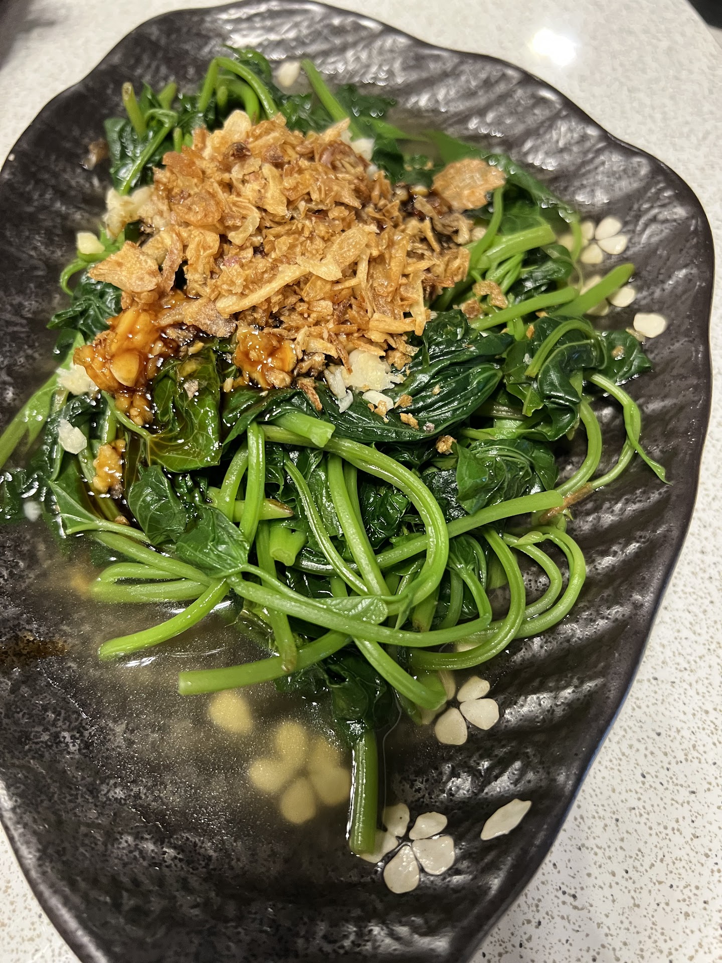 週六午間,來自多個家庭,開車前來此餐廳集合,車不多的鄉間小道,愜意又放鬆,與都市緊張步調有所區別,餐廳附設有停車位,先到者停好車就四處逛逛,或者進入餐廳吹冷氣,餐廳外觀簡約、有格調,在鄉間很引人注目,餐廳門口處展示冰櫃及水族活海鮮,內用座位區有兩個樓層,我們坐一樓,每桌以十人圓桌為主,裝潢設計也是簡單清爽,比一般快炒店好很多,桌菜一桌3,000元起跳,超級平價,看了這菜單,不難發現這就是這間店的價值,但我們選擇單點,據說這樣才能吃到這餐廳的招牌菜,我們分坐兩桌,每桌點的菜不盡相同,還點了霸王海鮮米粉鍋,滿鍋都是寶,大家卻搶著夾米粉,燒烤牛及豬肉也很不錯,口味及軟硬度恰到好處,鹽酥中卷很有嚼勁,也點了一些菜單上沒有的料理,口味稍重些,卻很下飯。