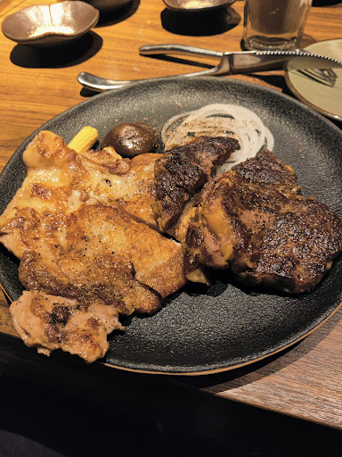 Read more用餐日期:2022.07.22(晚餐) 原先位於中正路上的一家牛排館,現在搬到內環路上,外觀日式低調的裝潢,沒想到生意在疫情期間更加得好,沒有網路預訂還不一定吃不到呢?除了裝潢升級之外,口味不知道有升級嗎? 口味:燒USDA肩胛羽毛厚切牛,肉質帶有些許筋,油花層次相當的豐富,不失軟嫩且帶有微筋的口感。五分熟最剛好,且外表多了一點焦香嚼勁感。搭配玫瑰鹽食用,可以襯托出肉質的鮮甜~ 手打雞腿+台灣嫩肩厚豚,雞腿醃漬的相當入味,外皮煎得焦脆且肉又多汁。嫩肩厚豚,採用里肌部位,肉質厚實多汁,口感相當扎實,完全沒有豬肉腥味! 佐賀胡麻沙拉,非常特殊的口感,胡麻醬相當的香且不會過鹹,有別於外面的胡麻沙拉! 法式香蒜軟麵包,個人覺得表現得中規中矩,不過裝麵包的容器倒是蠻特別的。 日式茶碗蒸,小小的一個不過其實也快吃不下了!有柴魚的味道,蒸蛋的部分較為Q彈,裡面還有一個小小的蟹肉棒! 日式甘薑豚飯,非常特別的組合,第一次吃到牛排店有如此搭配。飯的薑味不會過於厚重,甘薑的醬汁攪拌於米飯中,相當下飯。 雞湯,店家強調是由天然雞骨及新鮮蔬果熬製而成的清湯~(這可是無限續的喔!) 奶茶,奶香味很濃,而且不會過甜,相當的清涼解渴~ 果醋,吃了那麼多的肉,真的有去油解膩的効果,而且店家很貼心,連沒有點餐的小朋友也有一份。 價格:今晚兩大一小總共花費$790,個人覺得CP值相當高,這價格竟然可以吃到如此高品質的肉,真的是值得! 環境:用餐環境偏日式低調奢華感,可惜個人覺得光線稍微暗了一點。化妝室相當的乾淨,而且完全沒有異味~ 服務:服務相當的親切,會主動詢問今天用餐的意見。 速度:主餐約等了15至20分,不過中間陸陸續續有餐點上,不會讓您感覺等了很久~ 停車:沒有提供停車場🅿️不過附近要找到停車位應該不會太難,如果真的找不到斗家側門附近有一個付費停車場。 總而言之,這家日式的牛排館在我心目中可以排上斗六前三名的牛排館,沒想到這樣的價格,竟然能有這樣餐點品質,未來有機會...