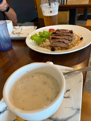 .義式香草雞野菇松露燉飯+套餐: -濃湯部分是以菇類為基底的濃湯,很濃郁我覺得還不錯喝 -燉飯的部分也很野菇~配上簡單調味的雞肉也很好入口!若是喜歡野菇口味的人可以點選這道👍🏻