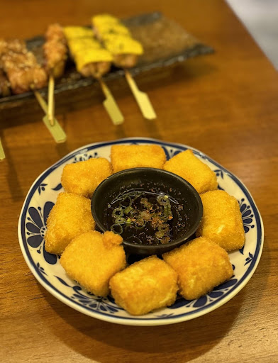 [#吃貨露西in斗六] 𓍱醬烤雞皮$50 𓍱豬五花番茄卷$60 𓍱松露牛肉串$120 𓍱松阪豬串炸$80 𓍱招牌唐揚雞$130 𓍱松露皎白筍$90 𓍱絲瓜蛤蜊湯$100 𓍱明太子奶油烏龍$150 𓍱炙燒鱈魚肝拌飯$120 𓍱Prime菲力牛排$270 𓍱午仔魚一夜干$280 𓍱Asahi黑啤$120 𓍼斗六的 #居酒屋 其實為數不多,露西常吃的也就那幾家,一直期待新的居酒屋來替這裡的宵夜場增添風采, #伊口 看來聽到我的心聲了!🤩打破對居酒屋的印象,外觀是由老宅改建而成,垂掛的燈串有一種酒吧的氛圍,走進店內是吧台,想欣賞師傅手藝就坐這,後面一區座位適合朋友聚餐,老闆還打算在外面增加沙發區,紫紅色日文字燈管寫著「今晩飲みに行こう」(今晚一起喝一杯吧!)光是亮著就讓人微醺了😏,裝潢用了復古的昭和元素,很跳tone的是,背景音樂不是平常的J-POP或演歌,而是非主流的日本樂團,時而輕快時而迷幻的RAP讓整家店的氣氛更慵懶,更想在這好好喝一杯了~🍺 𓍼 #醬烤雞皮 除了脆脆的雞皮口感多了特製醬料偏甜的味道, #豬五花番茄卷 是基本款,番茄中和豬五花的油膩, #松露牛肉串 一串兩塊吃起來很奢華,因為店家堅持用炭火烤,牛肉除了很多汁又和松露頗搭還多了一股炭香~😚 #招牌唐揚雞 個人覺得必點!送上來讓我驚呼,用蒸籠裝超可愛的每顆唐揚雞都圓圓的~😍可以沾著酸酸的醬一起吃, #松阪豬串炸 長得有點像可樂餅,外層麵衣酥脆咬下去一樣吃得到飽滿的豬肉! #松露茭白筍 也是首次吃到的搭配,烤得清甜的茭白筍和松露醬也碰出新火花!😝 𓍼 如果要吃飽這幾樣也很推薦~ #明太子奶油烏龍 雖然是常見菜色,但相當濃郁,攪拌均勻每一口奶油味都很濃郁! #炙燒鱈魚肝拌飯 這個讓我很驚艷,原來鱈魚肝拌飯這麼涮嘴,這我可以自己吃掉一碗!🥺 #Prime菲力牛排 適合點來大家一起分食,三分熟的菲力牛單吃就很美味,也能搭配一旁玫瑰鹽、洋蔥及蒜片吃出不同風味,伊口老闆特別喜歡在餐點中放生洋蔥(而且撒超多‼️)讓我吃得超滿足的~~😍 #午仔魚一夜干 也是吃居酒屋必點,脂肪較高的午仔魚,炭烤方式更能凸顯它的味道,肉質鮮美,搭配金桔、胡椒還有洋蔥(一樣撒滿!😝),一隻魚多種吃法~🐟 𓍼主食吃得有點飽了,來碗熱呼呼 #絲瓜蛤蜊湯 平衡一下味蕾吧!每顆蛤蜊都好大顆,湯十分鮮甜,抑或來杯黑啤也很滿足(不過這天氣更適合來點清酒?🍶),整餐吃下來伊口讓我很滿意~~(´˘`)在每一道餐點和裝潢細節都能看到店家的用心,突破我對串燒的印象,菜色種類豐富,IKOU伊口即「行こう」之意,冷冷的冬天,如果過了晚餐時間,不妨和朋友相約去伊口小酌,走吧!👋🏻