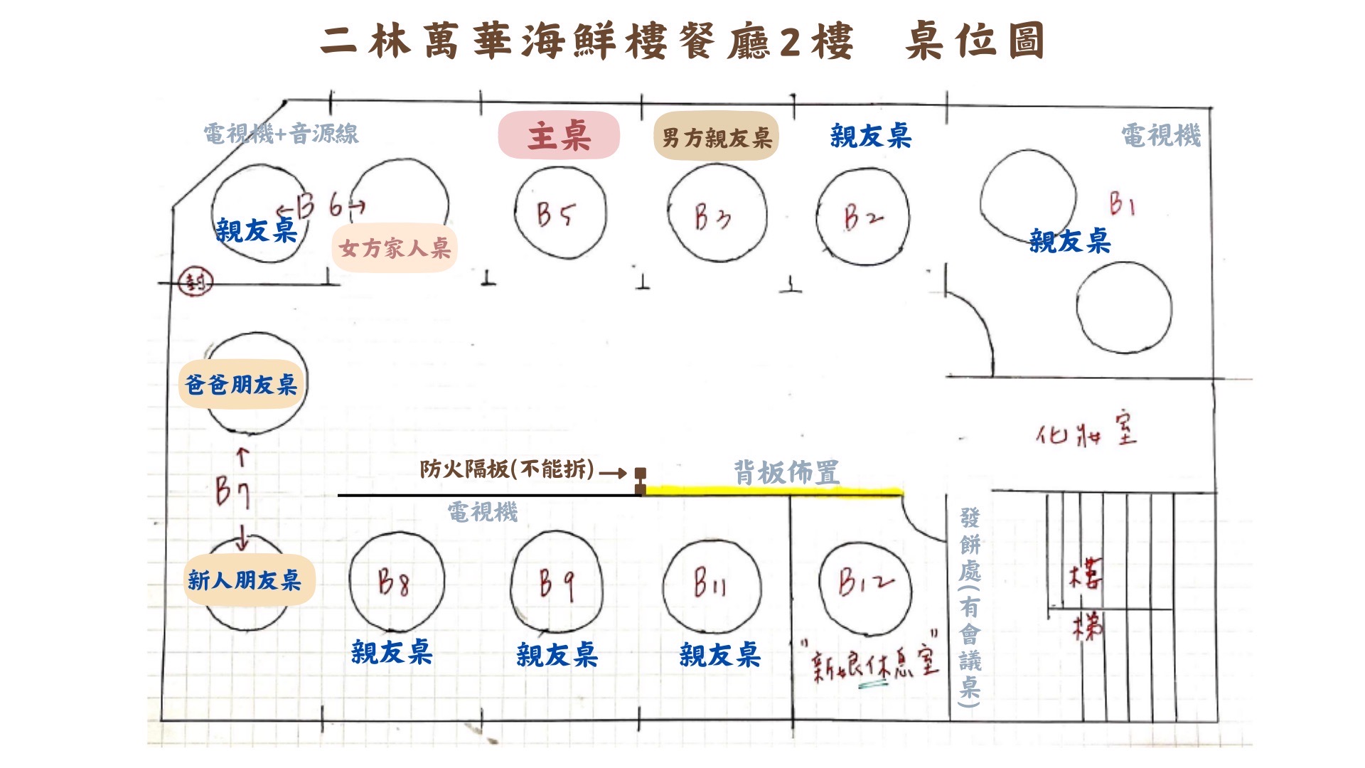 會建議主桌放置在B5的位置,B1的桌子雖然很大,但考慮位置的關係,所以放B5是較佳的選擇,而且坐10個人是剛好的!B12就是新娘休息室,都可以事先把婚紗照等等放在那裡。