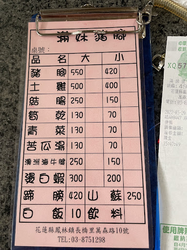 今天再度上門,新夥伴是從國外回來探親卻特別撥空參與鐵道之旅的同學素娥,以及台中陳姐,三人一起入座在滿妹豬腳餐廳裡,點了280元滷豬腳大約有六小塊,再燙一盤80元的青菜,兩碗白米飯20元,津津有味的吃光光,一解饑饞十分滿足,頓時消除長途跋涉的疲乏,重振滿滿的精神。 對我而言,又一次接近念念不忘的《滿妹》這個響叮噹的名號,是一種難以筆墨形容的幸福與甜蜜,彷彿與有榮焉,感謝好友願意同行與共享。