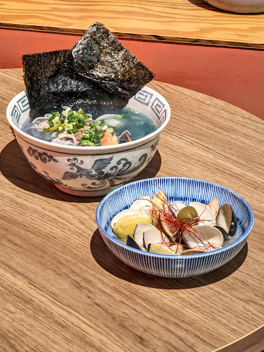 柚香鹽味拉麵🍜 $150 捲捲麵體 如蒸煮麵般的軟熟 飽足而呈現微微地彈韌 蝶豆花的靖藍 如深潛大洋中的幻化色澤 而柚檸的典雅酸氣 使海味增添了些海島氣息