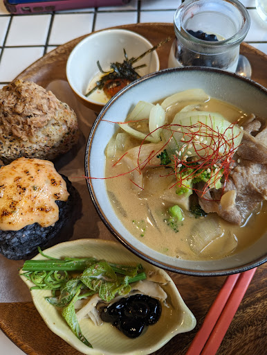 Ordered the sliced pork with boiled meat sauce Onigiri Meal with seafood salad and tuna Onigiri. The miso soup here is also excellent and comes with the meal, and all components of the meal are just superb. Highly recommend this place. It's amazing with an excellent atmosphere, but the prices here are definitely a tad high....