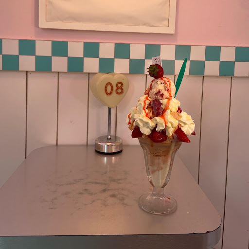 It was a hot sunny summer's day came to this awesome dessert shop which has a great vibe, I absolutely enjoyed the 80's diner like atmosphere! The dessert items are also quite unique. I had the Marilyn Monroe's Green skirt, I was a bit concerned about the sweetness initially, but it's not too sweet, just right ! The staff can also speak English and are great at explaining the items on the menu...