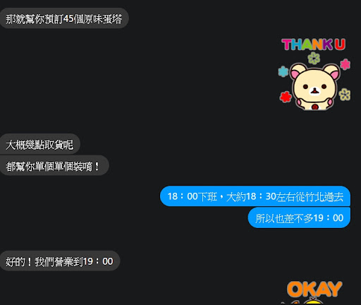 只是溝通上面的誤會,雙方面都有沒注意到細節,但是店家單方面直接取消客人訂單的態度真的...讓人心情很差!!! 7/13因為朋友推薦,第一次跟店家下訂小朋友的生日點心,要分享給班上同學,約定於7/16取貨 訂購時店家一直強調他們19:00關店,這幾天很擔心下班路上塞車會延誤店家下班 7/15晚上爸爸貼心的問可以改中午拿嗎?他利用中午休息過去拿 馬上詢問店家能否改中午取貨,店家回覆蛋塔固定下午13:00出爐,還客氣的多說了一句:還是要取消?在跟我們說就可以了 跟爸爸討論定案時,已經晚上9點多了,結論是7/16我提早下班1小時去拿點心 因時間已晚,所以想等隔日營業時間直接電話告知店家(店家11:00開始營業) 7/16早上照例忙小孩趕上學...回到家就看到早上7:49有未接來電1通...然後就看到店家傳來已經取消訂單的訊息...看到訊息馬上跟店家溝通...在不愉快的溝通中,氣急地問店家如果訂購訊息公開讓大家公審,這種單方面取消訂單的行為對嗎? 店家直接回覆:我們不在乎,如果到時影響我們商譽,我會有所動作,你要公開訊息就公開... 這種服務態度,很不可取,我公開訊息了,為了"你...