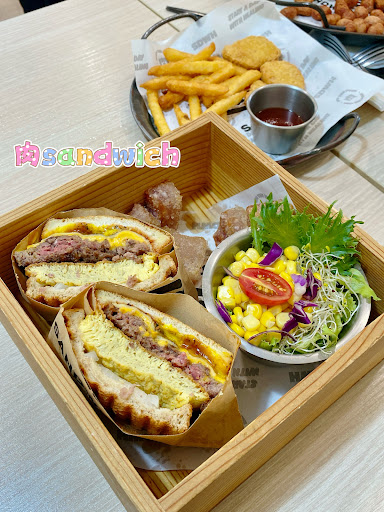 -肉之三明治 |起司牛B三明治| 吐司是白吐司和全麥土司二選一,我選全麥土司,裡面包了洋蔥、厚煎蛋、牛肉片、起司,一點黃芥末醬和番茄醬,我覺得普普~尤其是沒去邊的吐司不適合烤太久,我吃到的吐司蠻乾的還偏硬了點