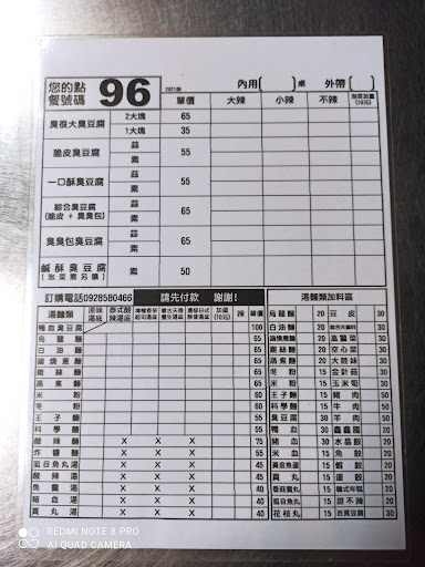 脆皮臭豆腐($55),一份有五塊。素就是不加蒜。臭豆腐聞起來很臭,但吃起來還好,外酥內軟(外皮不會炸到很硬)。泡菜帶有百香果味道,很脆。 綜合臭豆腐($65)是3塊脆皮加4塊臭臭包,臭臭包是臭豆腐外層再包上一層豆皮。 臭豆腐類唯一缺點就是胡椒粉偏多,有點蓋過臭豆腐的味道。 鍋燒意麵($65),湯頭有五種可以選擇,這次選了原味。只有四個火鍋料(半顆貢丸,小花,甜不辣,燕餃)跟一些青菜。 酸辣湯($45),是泰式酸辣湯,也是一樣有火鍋料跟青菜。 內用人多時先點餐然後等店家安排位置。
