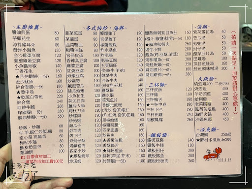 Read more新竹消費偏高眾所皆知 這家評論滑一下大概也知道 但是消費時間搞個三段式就讓人很難理解以及無法埋沒良心不告知 上面顯示營業時間最晚到11:00 照片最新以及門口張貼為0:00就是12點 實際消費10:30就趕人了 還跟你分樓上樓下 況且樓上收低消 時間還比較早 你們不想做太晚直接改成 餐館不更好?? 樓下沒桌給坐 安排樓上然後菜出的比阿婆生小孩還慢 然後吃了都還沒吃飽先告知樓上營業時間到10:30 問了一下樓下到12點可以先移到樓下但是最後點餐只到11點 是不懂這種商業模式是在趕客人還是搞服務生收拾第二次餐桌 基於服務生難請不為難選擇到點離開 但是花錢換的服務一次就夠了 新竹快炒店很多 不用來這種餐館營運模式的店...