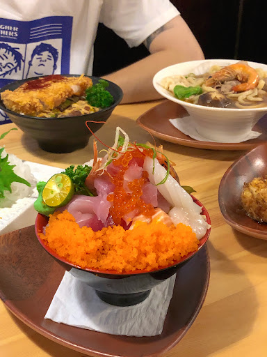 Read more周日中午用餐,餐廳約坐滿八成,店裝十分日式風格,店門口接待服務的小妹天真親切,店內餐點採自助,先結帳付款,與原先期待的日式感有些落差。 本來打算點海膽,順手滑了一下評論內容,發現評價有點二極,海膽的風評不佳因此改換了特級海鮮丼,抱著忐忑的心情等待餐點。 味噌湯有二鍋,新出爐的湯上面浮滿了肥美的鮭魚肚,不過很快就被撈完了,如果我沒有看錯,二鍋湯底分別選用紅味噌、白味噌二種選擇,客人們需要自己把湯底攪攪再盛湯,不然會很不均勻。 特級海鮮丼賣相浮誇,很適合拍網美照,生魚片食材也十分新鮮、蝦肉鮮甜、灑滿了魚卵,但這碗飯比較適合用來觀賞,碗口不夠寬,沒有考量客人享用的便利性,下方雖附有有一個盤子接著掉落的魚卵、生魚片,讓人吃的七零八落十分狼狽,暗自慶幸我不是來約會的,不然整個糗大;另外是,醋飯的米醋太搶味,配上不合味的豆棗,影響了整體的滿意度,建議應換上口味較和緩的米醋,與新鮮的漁獲相互呼應。 另外一分點的是烤魚丼飯,烤魚十分鮮嫩、好吃,但米飯過於粗糙,口感不佳,淋上偏甜口味的醬汁與小菜,顯的十分不搭。同樣的也是,沒有考慮到客人食用的便利性,因此我把拿來丟渣的盤子,放上了整支烤魚,才方便食用,但魚骨就只能丟桌上了,不是優雅的用餐形式。 用餐至此,已明白網友的評價落差,給看評論要來用餐的建議是,食材新鮮是本店最大的賣點,可以來點海鮮類食材,食材確實新鮮、單價也不算高,店家的手藝也還不錯;但飯類的表現差強人意,建議不點可提升整體用餐感受。如果需要主食吃飽的,當天現場看到許多人點麵...