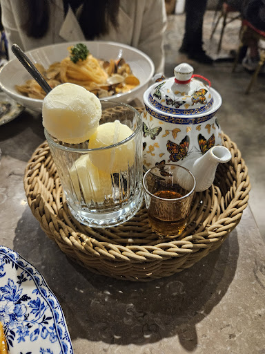 Food quality standard is subjective and I can only say relative to other similar restaurants nearby Big City, it falls short. My friend ordered their signature clam dish and I went with the chicken, the safer option. She felt the clams were small and dirty on the inside; some of them weren't even open. I probably should have chose a better restaurant to treat her to. The only good thing about the food was that it looked pretty so it's good for pictures, just like the rest of the place. However, so many people already have a picture posted with a giraffe; one could always find a more unique place. The drinks came in the cutest vessels. They were out of their famous earl grey so we ordered the matcha. Hopefully, I still provided the store with good food photos.