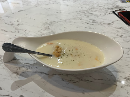 口味大眾,大部分的餐點表現都普通,酥皮湯的皮酥但無特別香氣;義大利麵醬汁稠度適中不濕軟,麵條無特別麥香,青醬奶味較重,因此羅勒的香氣相較遜色;蒜味骰子牛據男友表示,調味辣度偏高,我不敢吃辣就沒有試了,只試吃骰子牛,口感肉質軟嫩,有驚艷到;烤布蕾上層的焦糖厚度足夠,用湯匙敲起來是有手感的厚度。