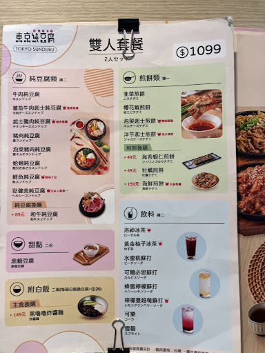 提供海鮮、肉類、特色純豆腐鍋,口味多達25種,只要點豆腐鍋就會附小菜與白飯,白飯可免費續加,豆腐鍋有三種秘製湯底可選擇,分別是鹽味(有辣)、味噌(有辣)、白湯底(不辣),辣度選擇有五種,初嚐可選一辛試試看,敢吃辣的朋友可依自己喜好往上調升!除了豆腐鍋,還有黑嚕嚕炸醬麵、各式煎餅,以及新竹 SOGO...