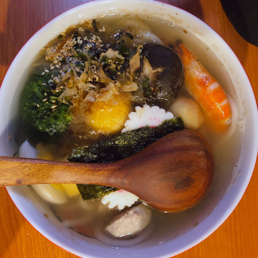 Read more*日式烏龍麵 清爽鮮甜用料實在 湯底喝起來非常清爽,明顯是花時間用去熬煮,不是用現成高湯粉,上桌撲鼻柴魚香氣,配料豐富,有魚板、魚豆腐、黃金魚蛋、貢丸、龍蝦沙拉、整顆水煮蛋、花椰菜、玉米筍、香菇、鮮蝦甚至還有牡丹竹輪。 蝦子很大隻,很鮮甜,煮的恰到好處,不會過老,香菇新鮮肥厚,光看心情就很愉悅。 *原汁牛骨牛肉麵 兩大塊帶骨牛肉,本來擔心肉很大塊,會不會過老過硬或過柴,沒想到咬下後,帶著濃濃的八角香,而且肉塊還有汁,不會柴也不會軟爛到失去口感。 麵條感覺很像手工拉麵,有嚼勁又不過硬,我超級喜歡這個麵條。 湯的部分也很好喝,有香氣但不會過濃或膩,我的舌頭只能喝的出來可能有洋蔥跟番茄做基底,白蘿蔔跟紅蘿蔔煮的很透但不爛,還有原本的清甜香氣。