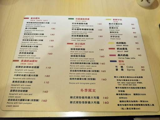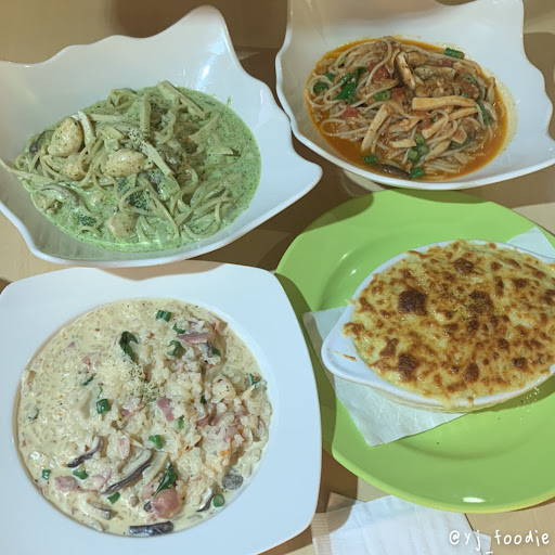 Read more▪️#招牌奶油辣味培根麵 💰$110 🌟5/5 ▫️#奶油青醬雞肉麵(加大)💰$170 🌟5/5 ▪️#咖喱雞肉焗飯 💰$160 🌟5/5 ▫️#義大利肉醬麵(加大)💰150 🌟5/5 這家義式餐廳除了平常會有的菜色外 還會有每一個季節限定的菜色~ 這家看起來很普通結果真的超好吃讓我們非常驚豔🥺 燉飯最怕沒有味道湯湯水水的那種 但這家的不會它超入味每粒米都有味道的那種💘 我點的是奶油辣味培根麵 可以選擇不辣 個人覺得有點辣但是還可以接受加一點辣可以解膩 培根沒什麼味道裡面的配料菇類等等都給不少 整體我覺得超好吃很後悔沒加大的那種🤣🤣🤣 朋友的麵都加大 相比加大真的蠻划算 而且麵也都有味道不是湯湯水水的那種💯 我只試吃而已沒辦法有太多評論但朋友們都覺超好吃 個人試吃也覺得不錯😆😆😆 咖喱雞肉焗烤超級入味還有奶油的味道配上起司 吃多有點膩但是店家飲料可以無限暢飲 配飲料的話還可以接受...