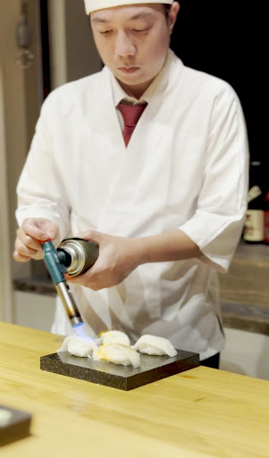 在上完前四貫壽司後會穿插治部煮,本次吃到的是燉煮雞肉。 必須說師傅的雞肉處理非常之好,雞肉本身滑嫩且Q彈,搭配偏甜的調味,最後再點綴檸檬香茅與黃芥末醬,夾在眾多握壽司之間卻絲毫沒有遜色的一道料理。