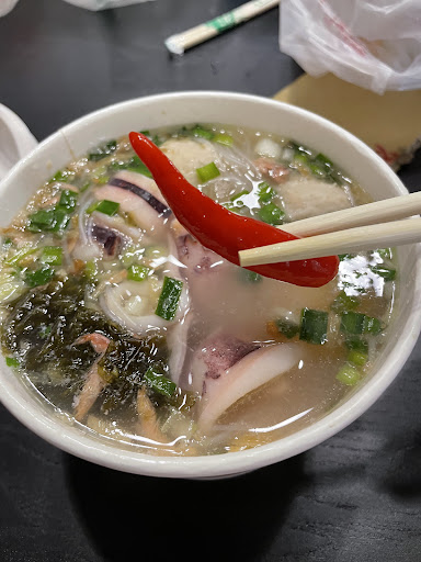 Squid Rice Sticks in Chicken Soup is a noodles restaurant which sells only one entry. It is the rice sticks with sliced squid and milk fish ball and sliced sweet potato in chicken soup. It is located across the Lakeshore Hotel, Hua Lien City.