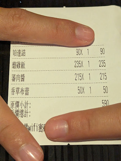 Don't eat here. Don't let the star rating trick you. The only good thing about this place was playing Rocío Dúrcal (Ya te olvidé). The food was pretty mediocre. I attach my receipt for your reference. First, we ordered a salad with "grana padano" cheese. It was a bunch of leaves covered with a sweet mayo for NT$90. Extremely disappointing. The pesto chicken risotto tasted like the normal green sauce you can get in any breakfast store, tons of cream, kind of sweet, bad for NT$235. The Bolognese pasta was also kind of sweet, too much cream, and as common as the red sauce of any cheap breakfast store. Bad for NT$215. 711 red sauce pasta is better than this. The creme brulee was very regular, the crispy top was soft and soggy NT$50. The waiters were so lost and they couldn't answer questions about the "chef special" and they were more focused on packing deliveries and answering phones than taking our order even though we were standing in the counter. If you are in Hualien and want to have a good pasta within the same prince range, please don't waste your money in this place, go straight to Arbay (not too...