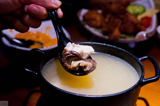 一訪時人較多,我們除了挑了串燒之外,也點了一桌菜。這時可點味噌炒烏龍,這味噌還頗講究,分一般味噌及京都味噌,一般味噌較鹹香,京都味噌即為白味噌,則甘美柔和。分這兩種的味噌的店家,還真不多見。還可點金沙魷魚、唐揚雞、炸豆腐、炒青菜及沙拉魚卵等等。再加一盅香菇雞白湯,一喝發現有特別鹹香,原來裡面放了蔭瓜,還真是很看人喝呢。