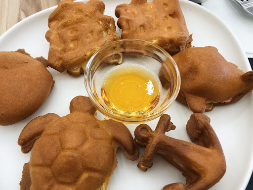 招牌雞蛋燒很可愛很適合拍紀念照,意外的好吃、很香,外酥內軟,仙人掌卡士達醬內餡吃不太到仙人掌酸、但甜甜好吃。附一小盒蜂蜜跟塑膠叉子,但沒用上。(船錨比較細,沒有內餡,但是外脆的口感最好,第一個吃船錨以為錯給原味嚇一跳)