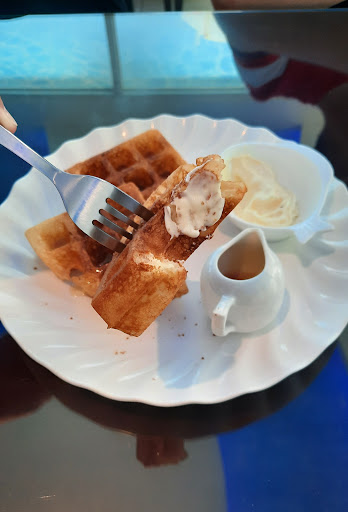重頭戲的鬆餅一端上來,我和我朋友就很期待,老闆也很仔細的教我們怎麼品味他們的鬆餅,老闆很有自信的說他們的鬆餅是全台獨一無二的,沒有人可以製作出和他鬆餅相同的口感,老闆先要我們品嚐原味,好好品嚐麵粉最真實的味道,果不其然真的很美味且口感很酥脆,可以看到出來是手工做的,因為可以從中看到一些孔隙。品嚐完原味後,可以開始沾著奶油吃,吃完奶油再吃蜂蜜,如果把蜂蜜和奶油混在一起就吃不出奶油的味道,不得不說他們奶油真的很厲害,奶油是冰的搭配上熱騰騰的鬆餅搭配的很剛好,蜂蜜也與鬆餅調和的很不錯,不愧是花蓮最強鬆餅難怪老闆這麼有自信,下次還會想嘗試不同口味看看。