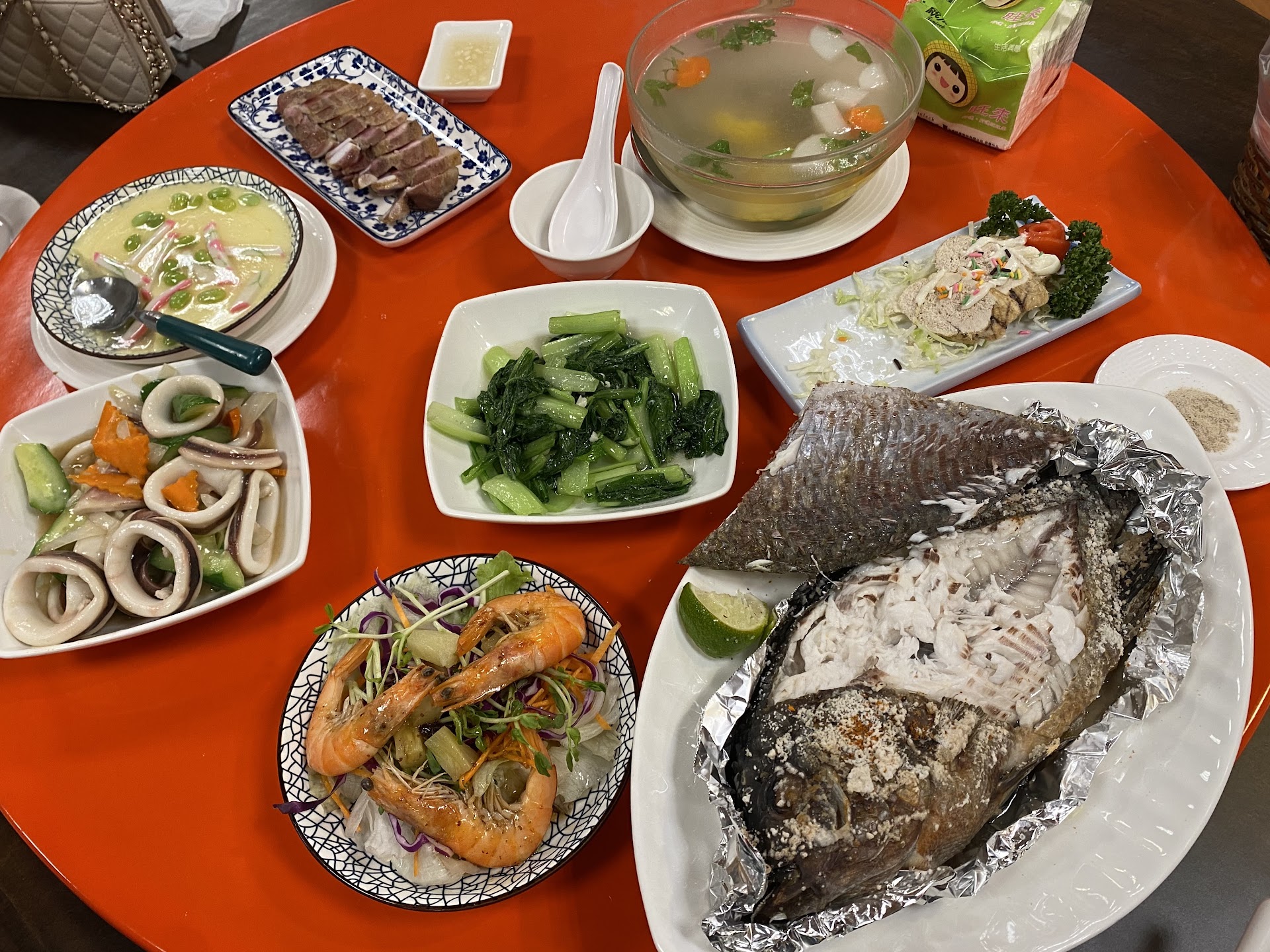 這次三人用餐,380元/人,大學時間在干城的時候吃了五次以上,這次是搬新址後第一次吃,覺得味道變了,滿心期待帶著爸媽來用餐,用餐前還說很好吃叫他們期待一下,結果這次真的大失所望😭 魚好像有點太早烤好?味道居然生生的... 沒有魚的鮮味,蘿蔔排骨湯的 湯頭也很鹹,鹹豬肉也普通,蝦子沙拉還不錯吃,白飯跟滷肉跟甜點也還不錯,老闆娘的態度也很好,只是食材真的變很多😢 烤雞要四人以上才有所以這次沒有、除了鹹豬肉以外就沒有肉了,建議四個人以上再來吃,不然菜色偏少,這樣價位會顯的偏貴沒價值,四人以上菜色比較多比較建議來,只是真的好失望,跟以前大學吃的味道差很多!!!!以前還有炒高麗菜現在只有青江菜😭...