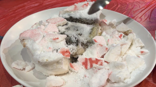上菜速度快 五人生日慶會點了~ 「鹽味烤魚」 創意的巧思、敲鹽塊的趣味過程 著實有讓人驚艷的感覺 魚兒肥大無土味 肚裡填有蔥蒜...