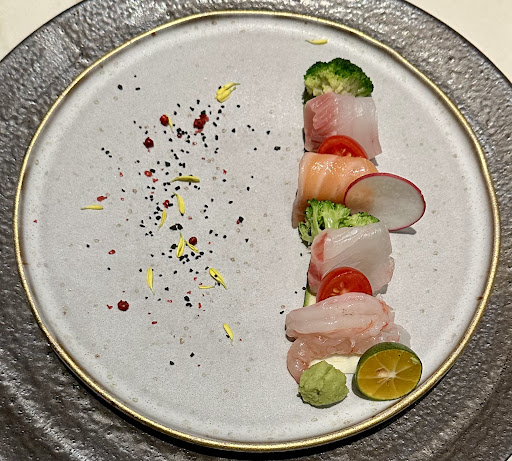 2023/9/1當晚所有的食材雖是高檔無菜單料理所常見,如生魚片(來自南方澳或大溪漁港的在地漁獲)、鮑魚、馬頭魚、美國牛Prime等,但讓我讚賞的是,主廚團隊將大家熟悉的食材揉入了特有的烹調匠法、食材混搭創意與細緻謹慎的調味,讓賓客味蕾可嘗到食材天然的口感與鮮味。我的解讀,每道菜的調味被定位在"最佳配角",負責襯托海鮮食材本身的甜味與尾韻,不搶戲卻缺一不可,實屬難得的大師級演譯,我給兩根大拇指!! Two thumbs up!!!