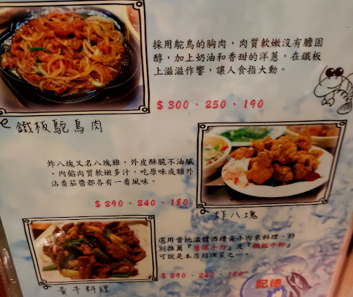 清炒鮮蟹250 鐵板鴕鳥肉190 酥炸西丁180 蔥爆牛肉180