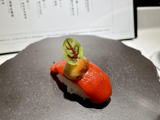 第十道: 這兩道是加點的,分別為 番茄蝦醬我壽司 番茄的果肉切片,厲害的是上面的醬, 菇類的口感真的很像蝦仁切塊~