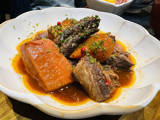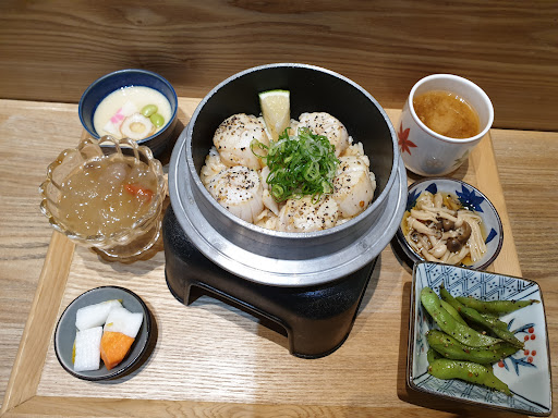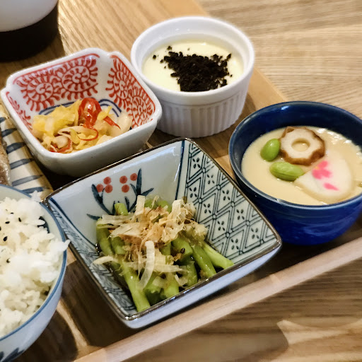 以總體300元以上的餐點來說。 整體偏鹹。 除了鹹之外,調味不足。 餐盤上的菜餚放置上也不甚美觀。 馬鈴薯泥不夠綿密和濕潤,裡面的紅蘿蔔也有沒熟的硬塊。 花椰菜很硬,有菜味,烹調不足。 看起來像豆腐的雞蛋捲很硬,調味尚可,柴魚片不夠,建議剛上就趕快吃掉。放久一點,雞蛋捲會吸醬油,會很鹹。 白飯使用關山米,可惜的是關山米本身的香味並沒有太明顯,但是粒粒分明,海苔粉和黑芝麻對套餐整體有加分作用。 醃漬小菜的部分,清爽清脆但是香味不足。 主餐的唐揚雞佐明太子醬的部分,唐揚雞汁多味美,咬開來的雞汁味道濃郁,但是不耐吃,比較容易膩,要沾旁邊的明太子美乃滋比較容易下飯。明太子美乃滋有點過鹹,明太子的量也沒有很多,對於如果期待嚐到明太子本身的味道的人來說,可能會有點失望。 加點的小份薯條的部分,薯條軟了,調味基本上可以,但是有點鹹。喜歡吃鹹一點,又喜歡吃到馬鈴薯口感的人可以嘗試看看。 甜湯的部分,清淡舒服,但是味道不夠明確,會讓裡面食材味道混雜在一起,很可惜。旁邊主餐的檸檬滴個幾滴之後,甜味更明顯,食材也能更有層次的發揮。 此外,同行的另一人點了奶油干貝飯。 奶油下的量不少,卻吃不太到奶油的香氣。 奶油的選擇可能要再下功夫。 干貝大顆,但是欠缺調味。 鋪底的蒜香奶油飯,蒜頭感覺還有點生,飯感覺有點膩。 這道套餐配上醃菜的時候,並沒有更加清爽,而是有點甜膩。 這兩個套餐有附飲料(沒提醒的話,似乎還差點被漏單?) 一個選綠茶一個選紅茶(如果沒有特別加價換飲料的話,是這兩個選擇) 綠茶的部分入口清爽,但是留在喉頭的沒有多少茶香,而是久久不散的苦澀味。 紅茶的部分,一入口就可以感受到很重的焦苦味,並不是很舒適。